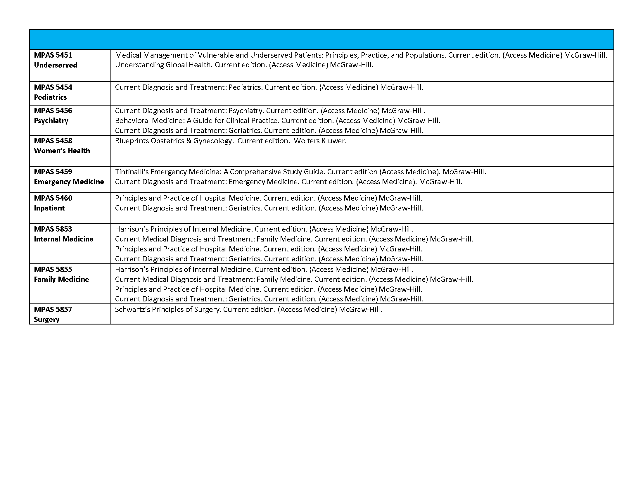 Students are required to use the MOST CURRENT EDITION of all textbooks. Most textbooks are available through the Gibson D. Lewis Library on the UNT Health campus through AccessMedicine.