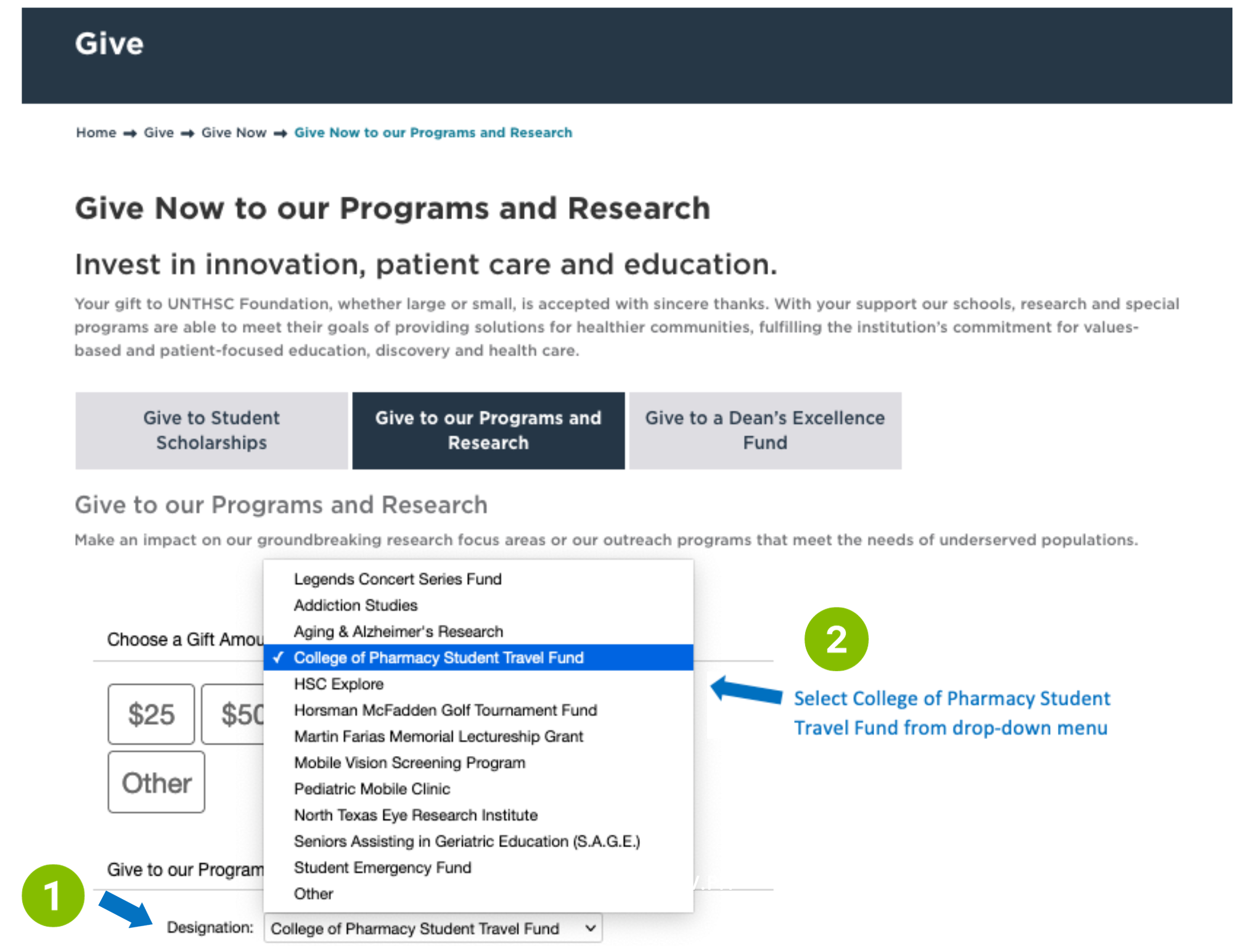 Donations from the the 10th Anniversary Event support the Student Travel Fund, which helps defray costs for student development travel. If you would like to make a donation, click on the link below. Under the “Designation” options, select “College of Pharmacy Student Travel Fund.” See an example here.