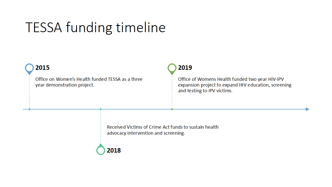 Originally a three-year demonstration project funded by the Department of Health and Human Services’ Office on Women’s Health in 2015, TESSA has provided community and professional training, screening and services related to interpersonal violence. Additional funding was secured from the State of Texas Victim Assistance Division and again from the Office on Women’s Health in 2019.