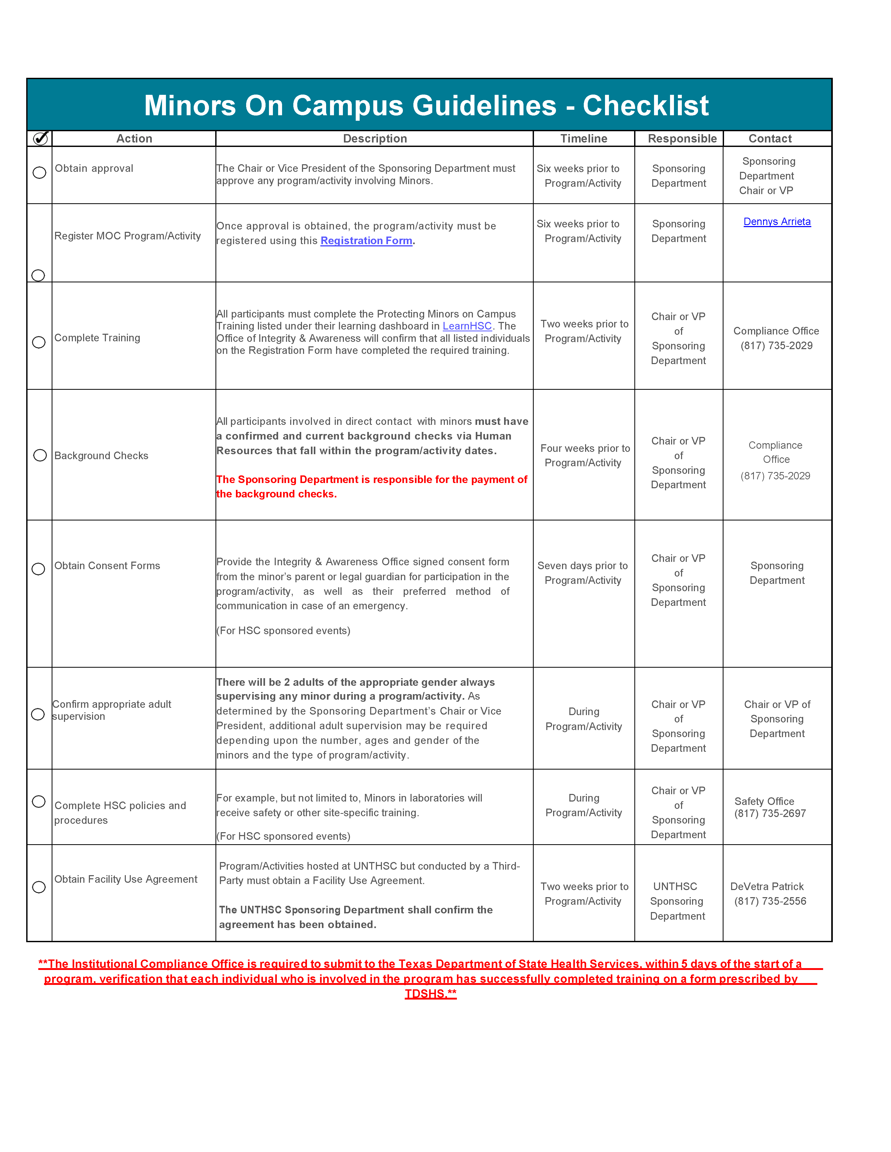 To print the Minors on Campus Guidelines Checklist click this link: MOC-Checklist