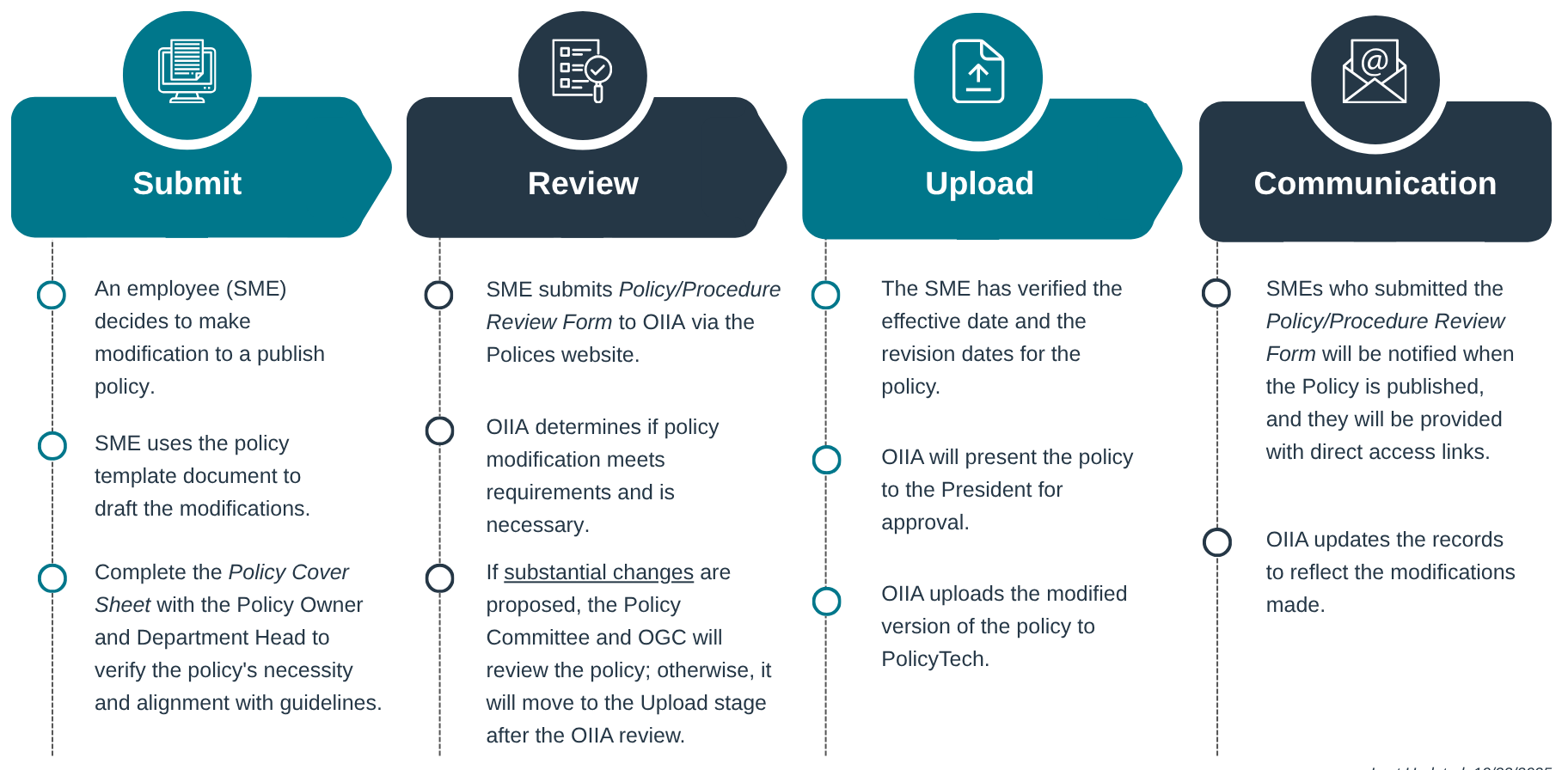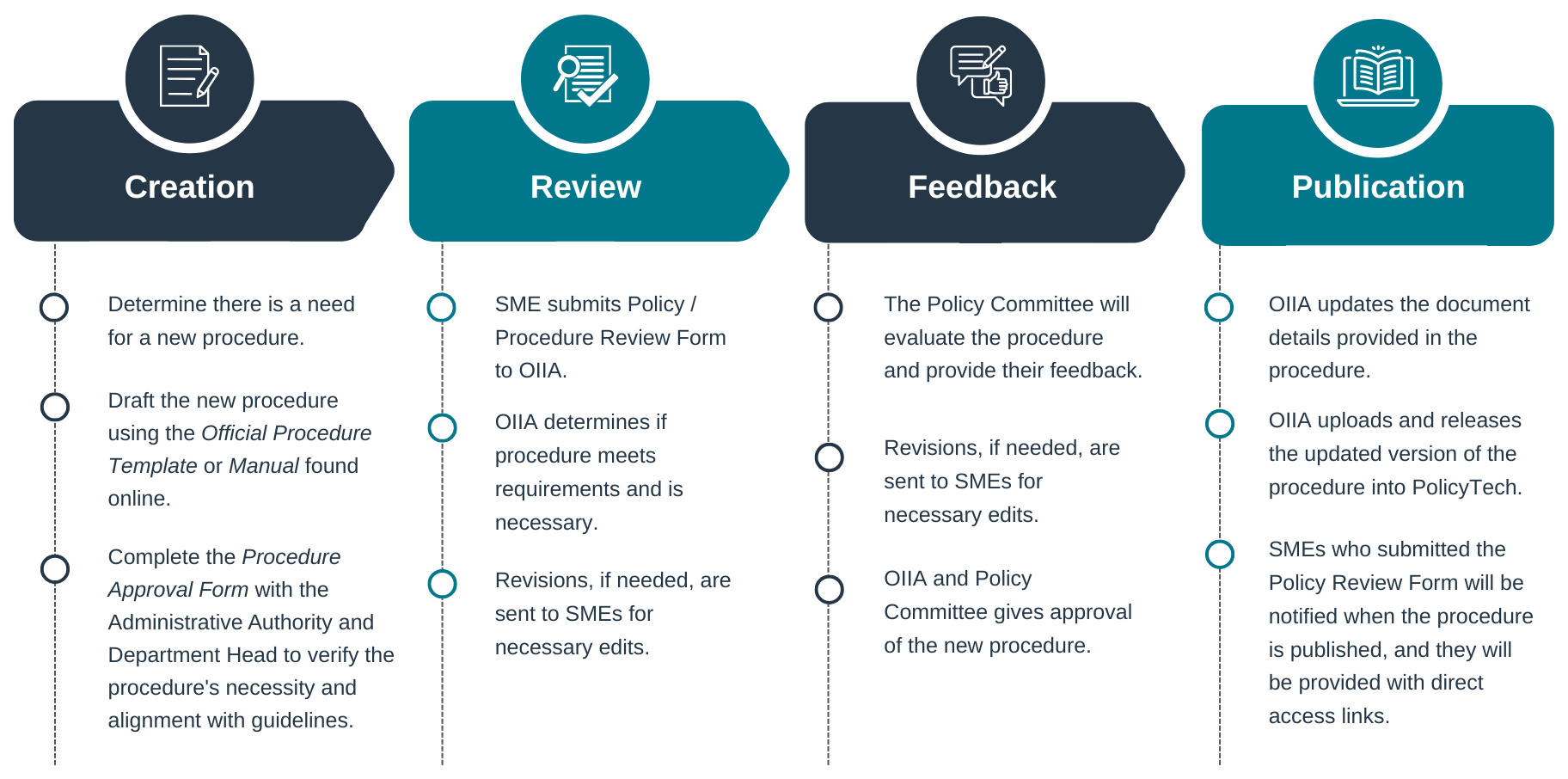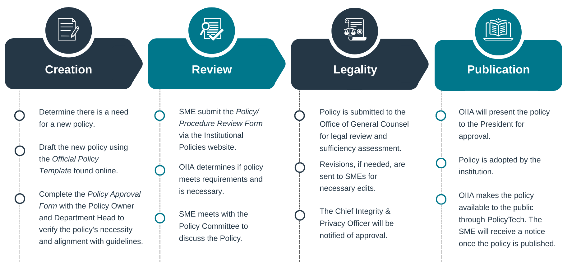 *OIIA oversees the process of defining, developing, implementing, and maintaining up-to-date university-wide policies and procedures. However, it is important to note that OIIA does not write policies or procedures for individual departments, programs, or organizations.