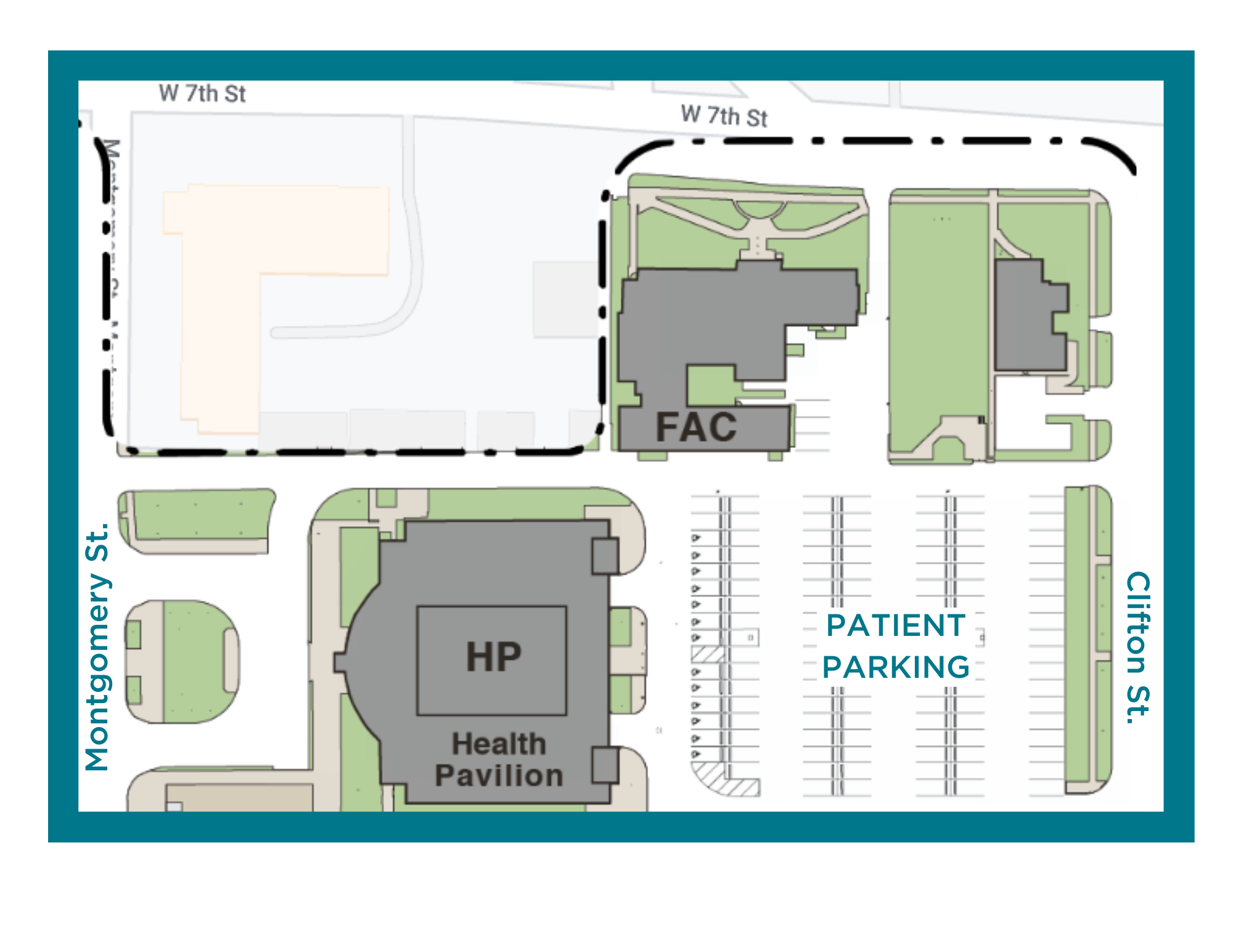 You may park in patient parking, which is located behind the Health Pavilion. If you make the block and turn down Clifton St., you’ll see uncovered parking on the hill. In addition, there is dedicated parking closest to the building for seniors. Once you’ve parked, come to the elevators directly ahead through the double glass doors to the patient elevators.