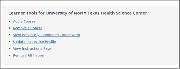 • At the bottom of the next page, you will click “Add a Course” in the box labeled Learner Tools for University of North Texas Health Science Center.