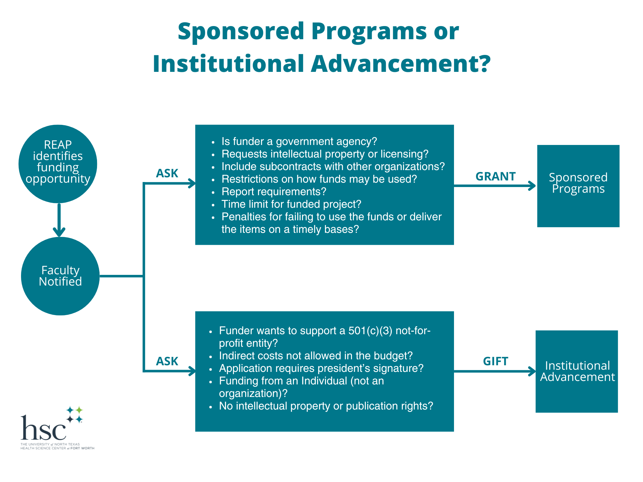 The accurate classification of funding is important to develop positive relationships with external funders, avoid delays in releasing the funds, and violating policies and regulations. UNT Health Institutional Advancement (IA) and the Office of Sponsored Programs (OSP) collaborate to classify funds based on the funder’s intent and requirements and compliance with University policies and Federal and State mandated regulations.