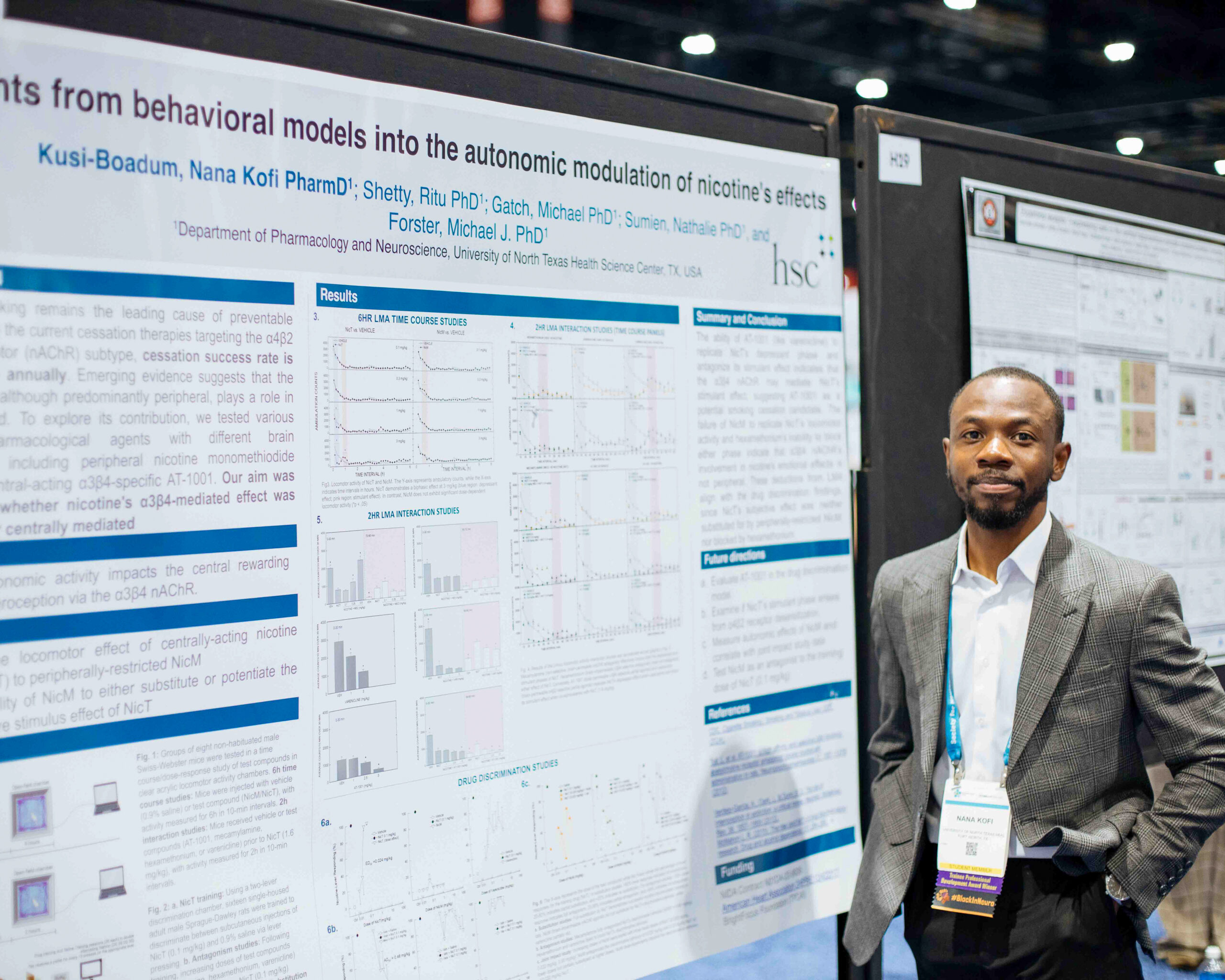 The travel award allowed Kusi Boadum to attend the SfN2024 Conference in Chicago, where he made two poster presentations on his research titled “Insights from Behavioral Models into the Autonomic Modulation of Nicotine’s Effects.”