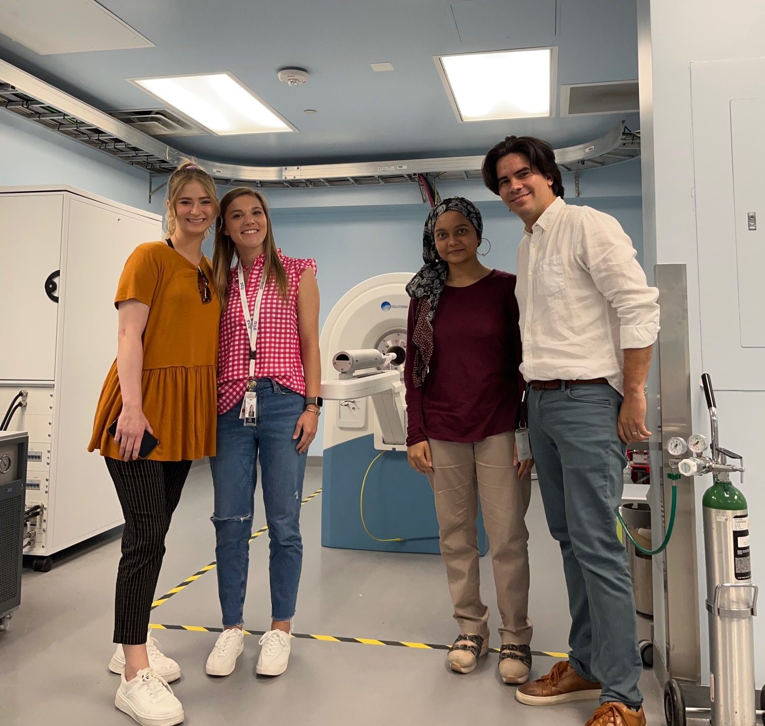 Kaylee, Samia, and Luis in front of the 7T MR Solution MRI scanner.