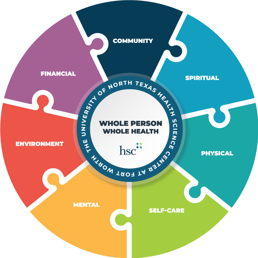 Whole Health is empowering people to discover, receive and participate in care for their body, mind, spirit and environment within and through their communities. UNT Health recognizes and works with communities toward these seven components of Whole Health.